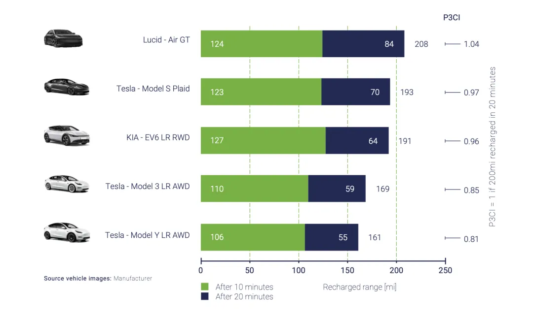 Lucid Air GT 以 P3CI - US 为 1.04 成为 2023 年 P3 Charging Index - US 的总冠军,在 10%-80% SoC 之间的平均充电功率为 147 kW,但由于能耗低,20 分钟后可以充电 208 英里。