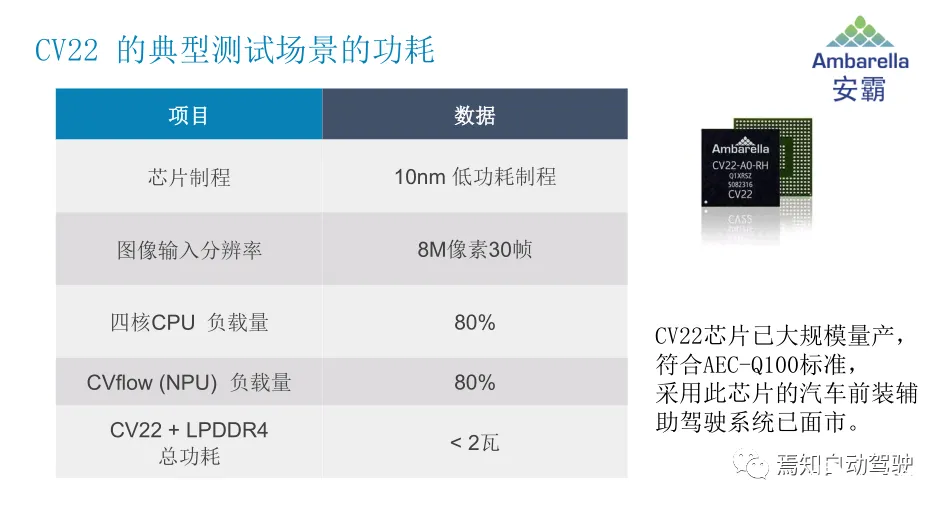 CVflow 工具可以深度学习训练框架,当客户导入神经网络时,在量化、转化、验证过程中,就可以得到结果。虽然各家都有类似的方法,但安霸这套工具从最初量产到现在已有三年时间,经过反复迭代支持市面上绝大部分主流神经网络。用这套方案研发的系统不仅具有高性能,功耗还非常低,运行采用 800 万像素的图像输入的深入学习算法时 CV22 的功耗小于 2W。
