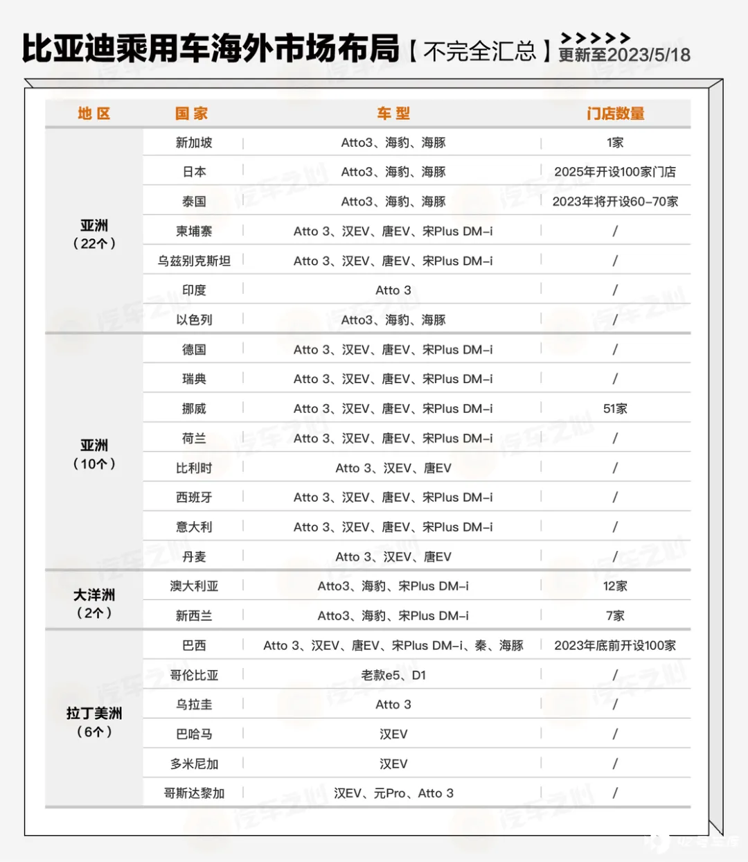 - 亚洲 市场:比亚迪计划到 2023 年要建成 70 家 门店。