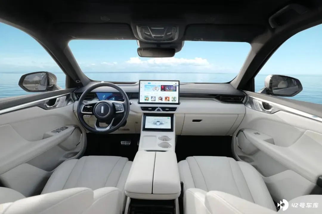 在智能座舱方面,这款车搭载了 9 英寸 W-HUD、9.2 英寸数字仪表屏、14.6 英寸中控屏、9 英寸触控面板屏,四块屏幕可以联动实现信息互通。