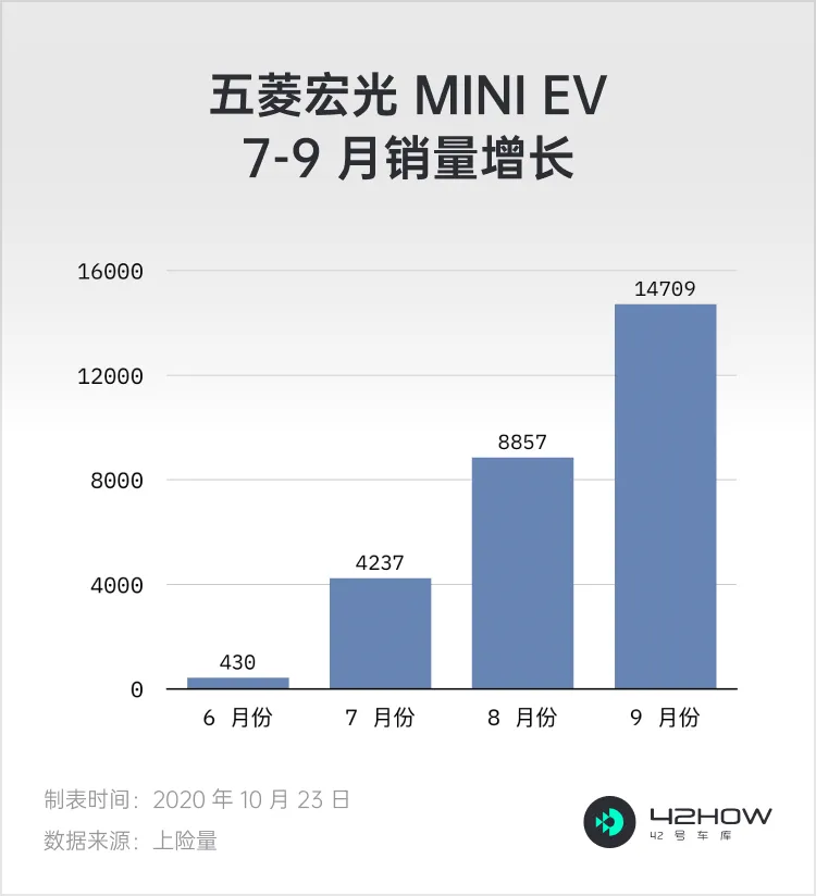 我也曾一度错误地认为宏光 Mini 的主要发力点会在北上广深这样的限牌城市,但会因为低到离谱的续航表现、惨不忍睹的配置,除了便宜,一无是处的产品力表现,在一线城市销量表现肯定不会太理想,然而宏光 Mini 在 5 月 28 日开启预售,6 月份就收获了 430 台销量成绩,7 月份成都车展发布,上市短短 7 天销量就已达 7348 辆,20 天后数据上升到 15,000 辆,在 9 月份的销量突破 10,000 台,且依旧以高速率保持增长,臆想与现实的反差,真是打碎了我的老脸。
