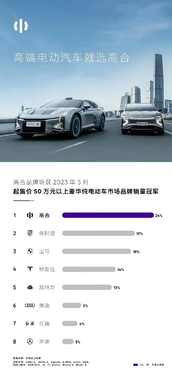 有不少网友对高合汽车的未来感到担忧,但人家自己却两耳不闻窗外事,一心一意做豪车。每个月不仅按期发布销售排名,并给自己冠上了一个荣誉称号:「50 万元以上豪华纯电市场冠军」。