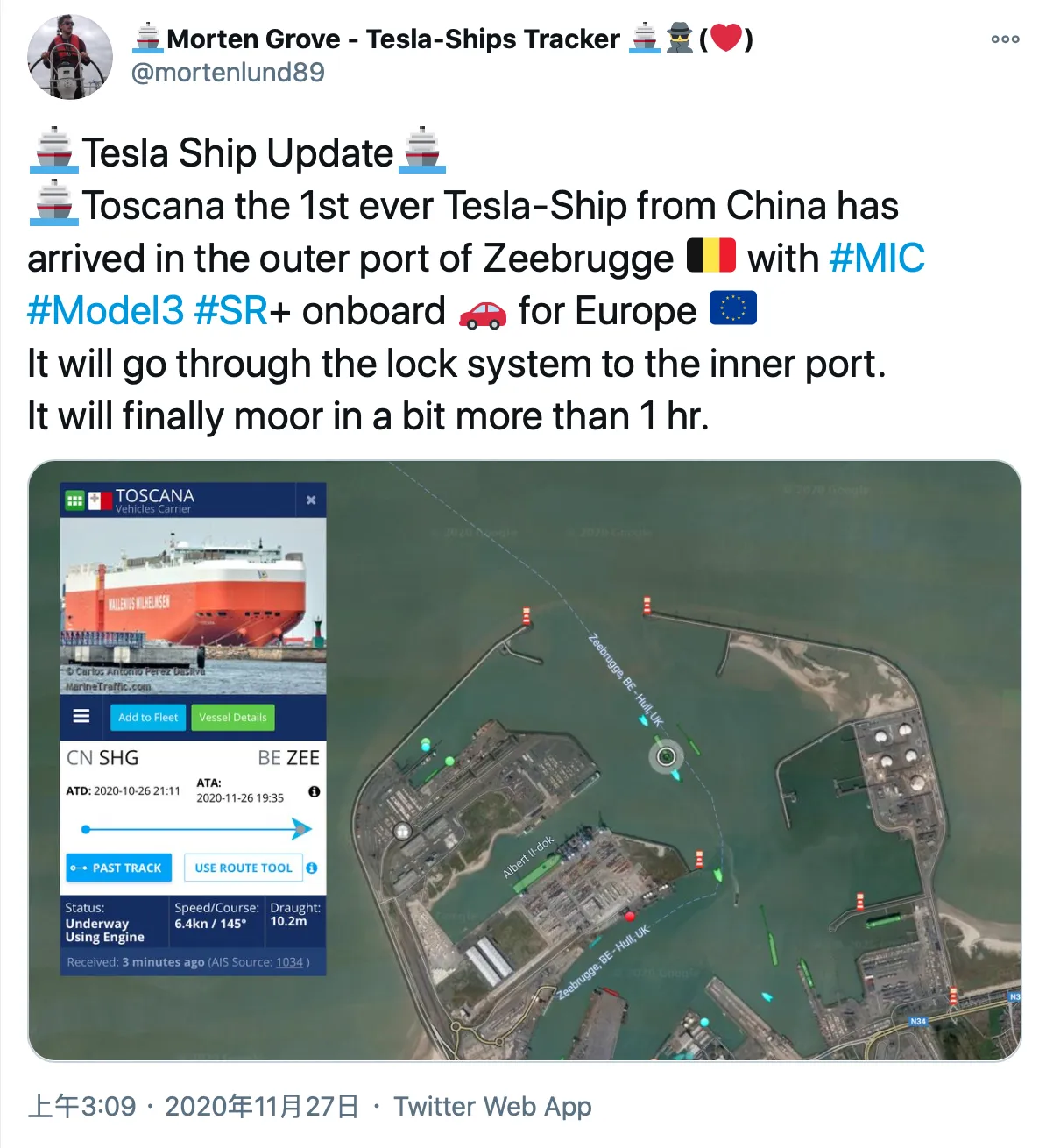 据推特网友 Morten Grove-Tesla-Ships Tracker 消息,搭载 Model 3 的托斯卡纳号(Toscana)终于抵达比利时泽布吕赫。他还提到,托斯卡纳号停泊在大极光号(Grand Aurora)旁边,而大极光号装载着特斯拉美国加州弗里蒙特工厂刚刚生产的 Model 3。