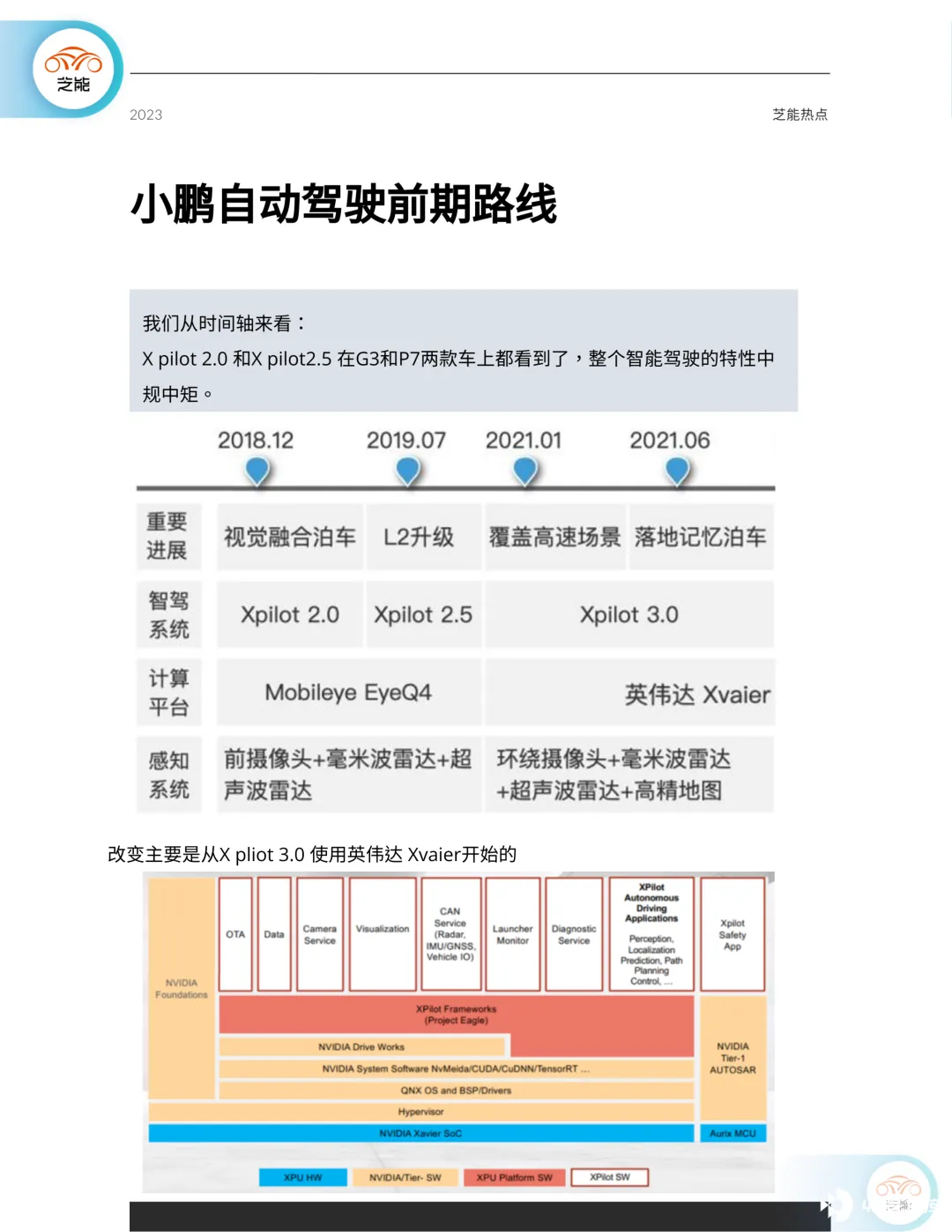 X pilot 2.0 和 X pilot2.5 在 G3 和 P7 两款车上已经展示了出来。整个智能驾驶的特性中规中矩。真正的改变始于 X pliot 3.0 使用英伟达 Xvaier 的。