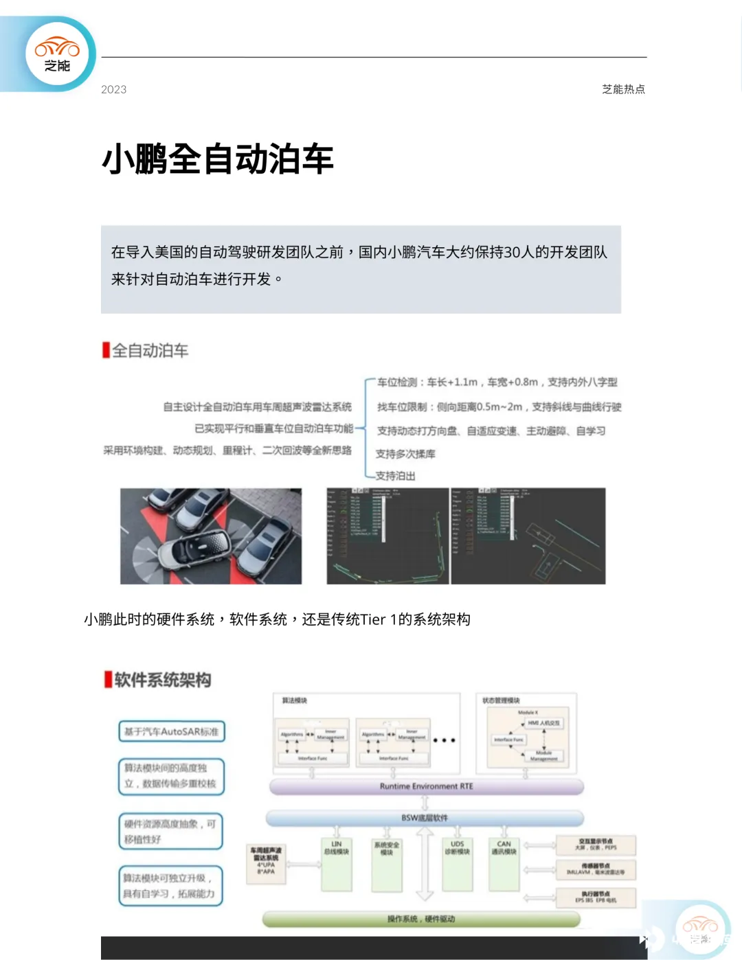 这一阶段由肖志光主导,当时国内自动驾驶团队近 30 人,开发了全自动泊车和自动跟随等功能。此时开发阶段,更像是传统 Tier1 在围绕自动泊车功能攻坚克难。2018 年 4 月,小鹏发布了 G3 全场景自动泊车技术(XPILOT 2.0),利用 20 个传感器,进行视觉功能,实现自动泊车,主要是实现最后一公里的智能驾驶。