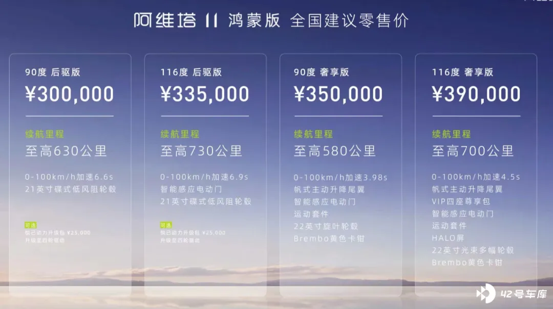 四款车型,售价 30 万元 -39 万元。8 月 24 日,阿维塔 11 鸿蒙版正式上市,「咬住」30 万元价格底线 。