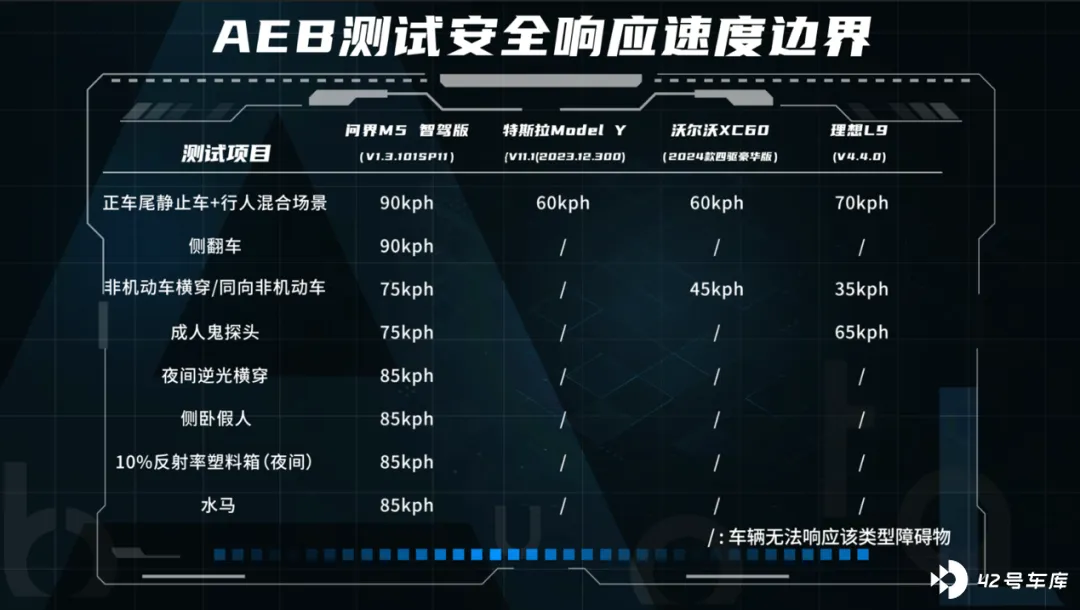 在更极限的侧卧假人场景,其他车型根本无法识别而直接「弃考」,问界 M5 智驾版不但能识别假人还能做到 85km/h 下稳定刹停,95km/h 下能刹到 51km/h 的碰撞速度。