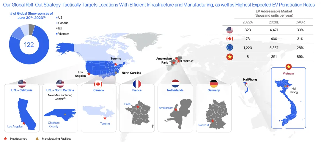 这些车,都是在越南挺难销售的,得往美国、加拿大和欧洲进行销售,从越南向美国出口了约 2100 辆车,实际上只卖掉了 100 辆。为了满足 IRA 的要求,VinFast 宣布将投资 40 亿美元在美国北卡罗莱纳州新建汽车工厂,预计将于 2025 年开始试运行,目标是第一阶段每年生产 15 万辆,零部件和材料的供应商来自全球。