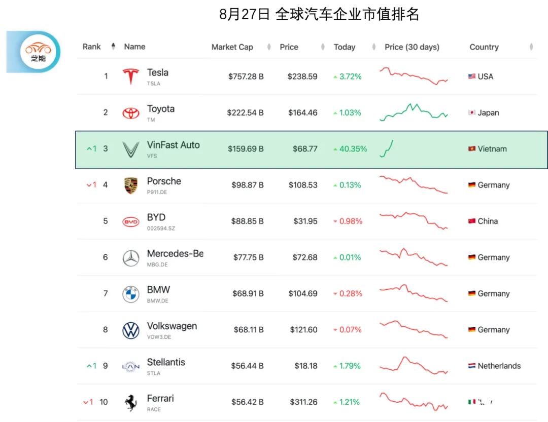 近期 VinFast 上市,引发了美股投资者对于整车企业的关注。 VinFast 的市值已经达到了惊人的 1596.99 亿美元, 如果以人民币计算,市值已经超过了万亿, 成为全球第三大汽车制造公司,仅次于特斯拉和丰田。 Vinfast 市值的飙升与 VinFast 的基本面似乎脱钩,引发了一些市场观察者的警告,我们也对这家公司的情况做一些整理。