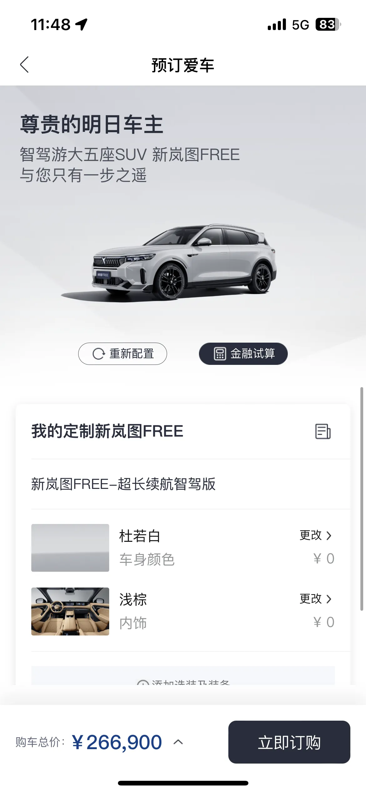 之前家里只有一辆传统燃油紧凑型SUV,自从21年家里添了宝宝之后就在考虑增购一辆空间大一点的车。主要就考虑新能源车,所以除岚图以外,蔚来、小鹏、理想、极氪、特斯拉等品牌都有了解过,经过一番对比进入决赛圈的有理想L7、蔚来ES6、极氪001,直到看到岚图在武汉开用户之夜的广告,新岚图FREE也进入了决赛圈。身边有朋友开老款FREE,他也一直在考虑置换新FREE,就在他的推荐下下了5000定金,当时心里还想的是“反正不买也可以退”,但在发布日当天26.69万的价格公布之后,我想应该也没啥好犹豫的了,单从价格、配置这两点和其他几款决赛圈的车型对比,性价比没得说了。试驾之后,直接锁单~