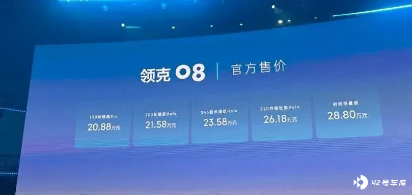 除了这些,领克 08 的价格信息,我们也在这里同步一下—— 此次领克 08 提供 5 个版本,售价落在 20.88-28.80 万元区间内。正式的价格较之前的预售价有所降低。