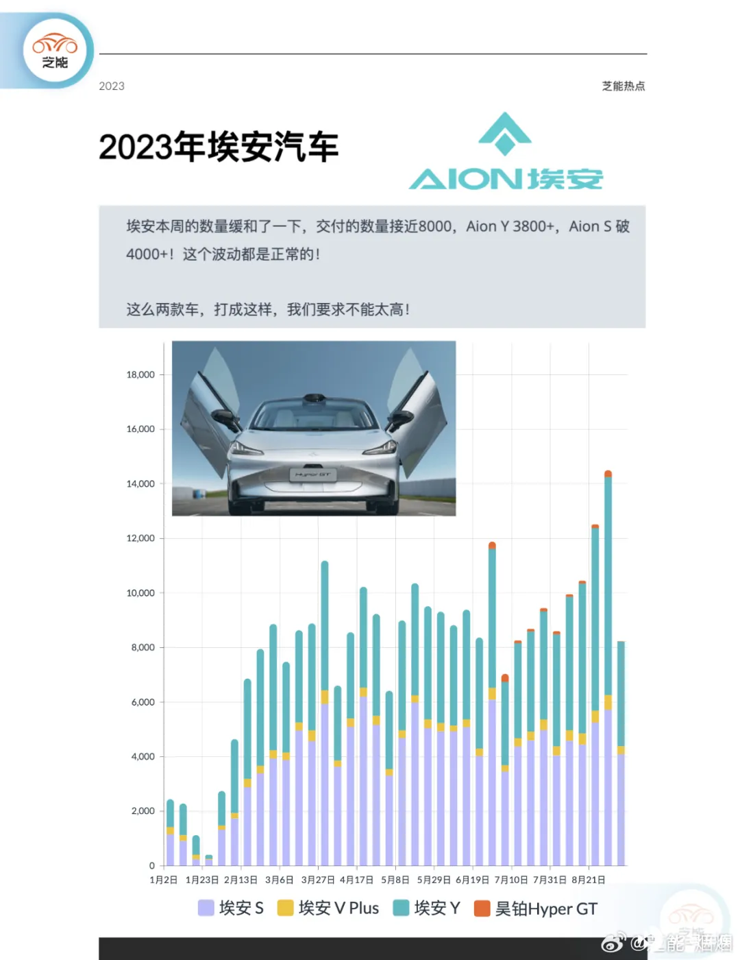 埃安本周销量稍下降,总交付量接近 8000 ,其中 Aion Y 达到 3800+,Aion S 突破 4000+。这种波动在预期之内。