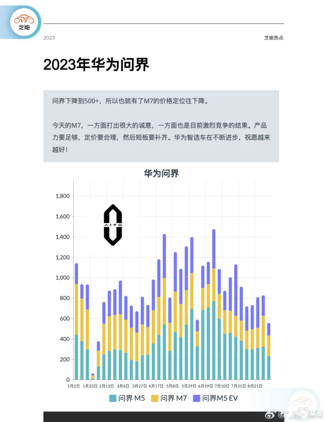 问界销量下滑至 500+ ,受销量影响,昨天新发布的 M7 的价格定位也往下调整。当前的 M7 不仅体现了其决心,也是市场竞争的产物。产品力足够,定价合理,短板正在补齐。华为智选车在不断进步,祝愿越来越好!