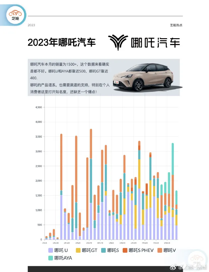 哪 吒汽车本周销量达到 1500+,表现相对不佳 。其中,哪吒 U 和 AYA 销量均接近 500,哪吒 GT 接近 400。哪吒汽车仍需渠道支持,提高在个人消费者中的知名 度,并寻求创新亮点。