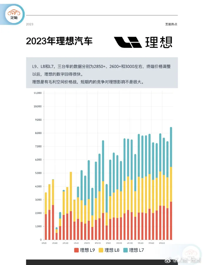 L9、L8 和 L7,三台车的数据分别为 2850+、2600+和 3000 左右,终端价格调整以后,理想的销量数据回升很快。 理想是有毛利空间价格战,短期内的竞争对其影响不大。
