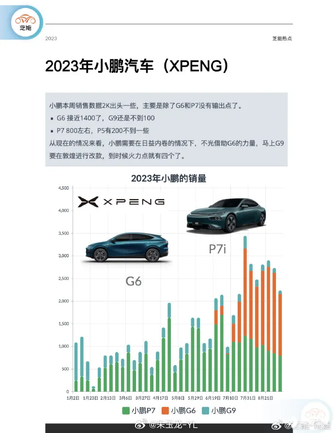 小鹏本周销量达到 2K ,主 力车型为 G6 和 P7。