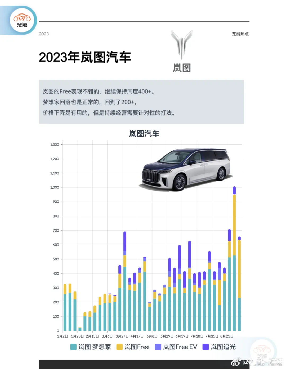 岚图的 Free 销量表现不俗,稳定在 400+ ,而 梦想家 则回落至 200+ 。价格策略有效,但品牌持续运营仍需策略调整。