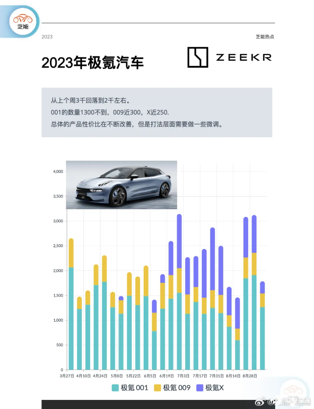 极氪本周销量从 3000 下降到 2000 左右 ,其中 001 不到 1300,009 近 300,X 接近 250。尽管产品的性价比在持续提高,但策略上仍需适当调整。