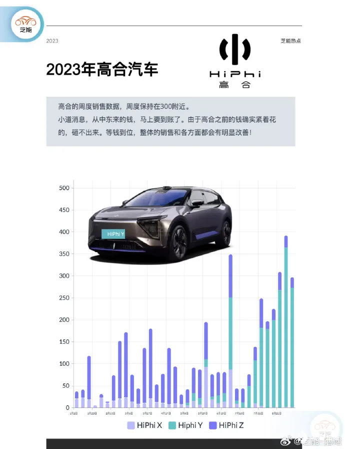 本周, 高合汽车维持约 300 的销量 。小道消息说从中东的投资马上要到账了。预计这将改善高合的整体经营状况。