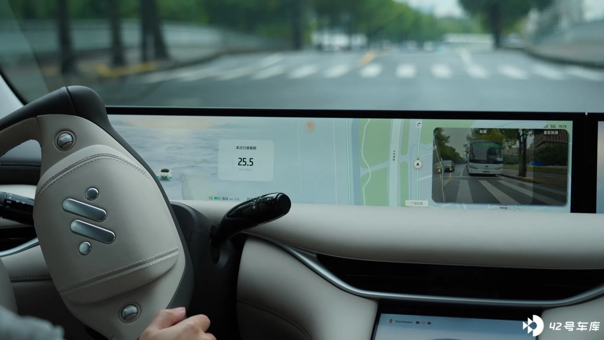 另一方面要对比的是屏幕的布置,智己 LS6 将仪表、中控合二为一,视觉上更有整体性。配合半幅方向盘,完全不会遮挡屏幕。驾驶过程中,所有信息都显示在一块屏幕上,不需要在多块屏幕间来回切换视线。