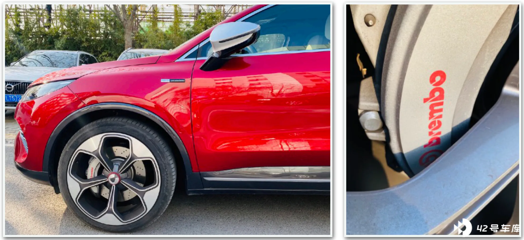 外观设计⾮常圆润,⼤红⾊很有质感,有点类似于⻢⾃达的魂动红,阳光下有⼀种红⾊流转的颜⾊渐变。22 ⼨的超⼤轮毂,Brembo 的卡钳配合宽体⻋身,显得运动感⼗⾜。