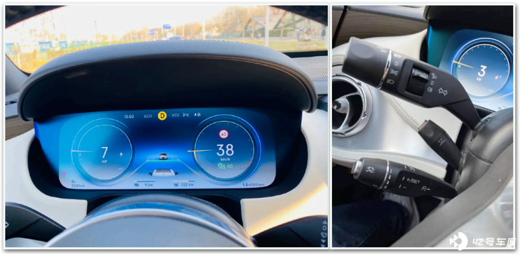 开启逻辑有些复杂,ACC 是⽤拨杆,但是⻋道保持需要在⻋机中单独控制,这⽅⾯⽐造⻋新势⼒明显落后⼀些驾驶过程中 ACC 反应还算可以,加速减速都⽐较平缓,但是在 ACC 刹⻋时如果驾驶员也介⼊偶尔会产⽣抖动,不知道是否个例。