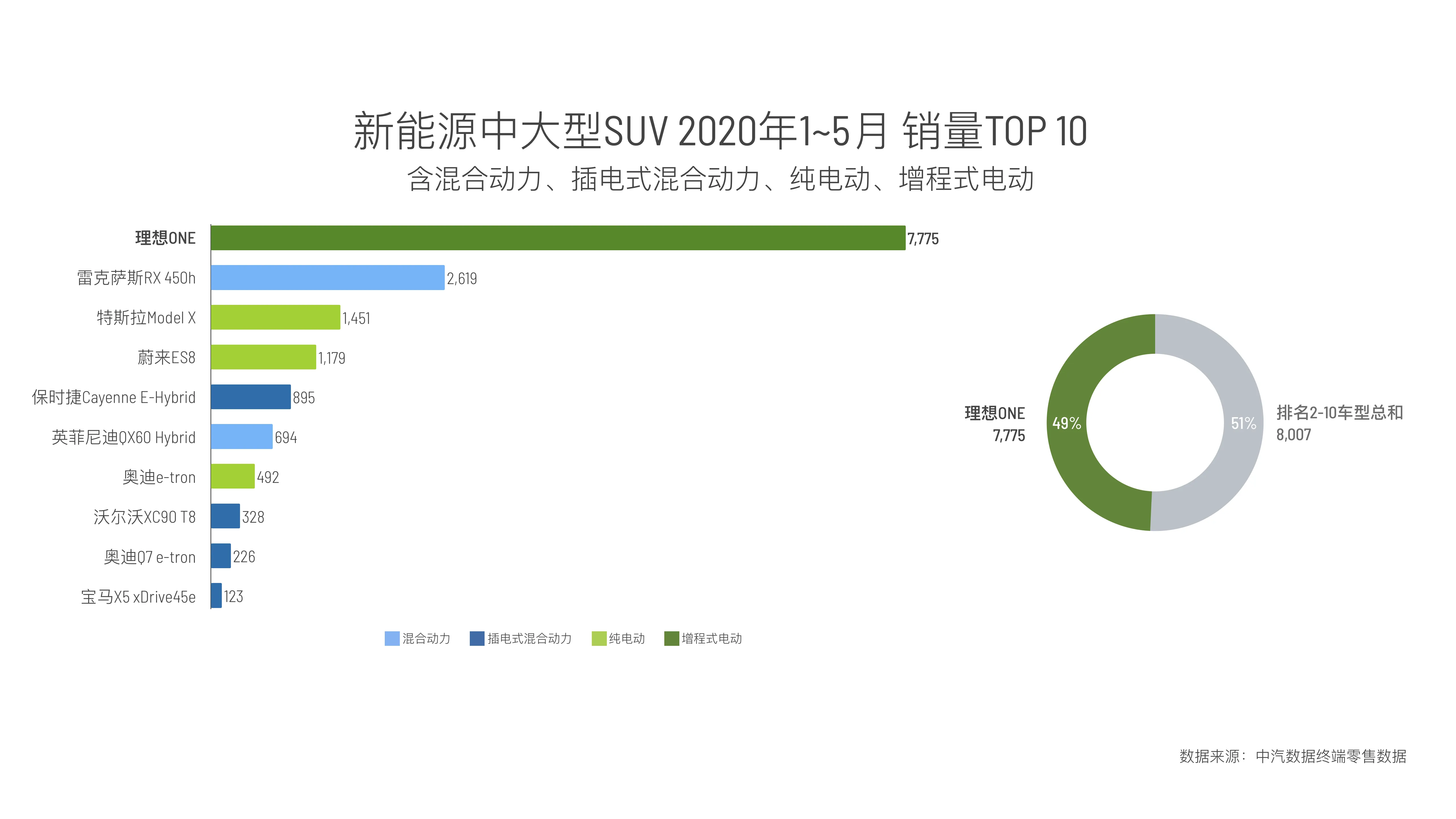 根据中汽数据终端零售数据,2020年1月5月,理想 ONE 成为中国新能源中大型 SUV 市场(包含混合动力、插电式混合动力、纯电动、增程式电动)的绝对领先者,销量超过第二名到第八名的总和。
