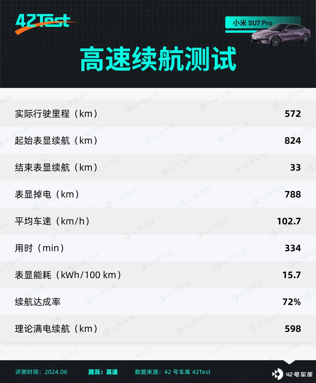 最终小米 SU7 Pro 高速续航达成率为 72%,理论高速续航 598 km。