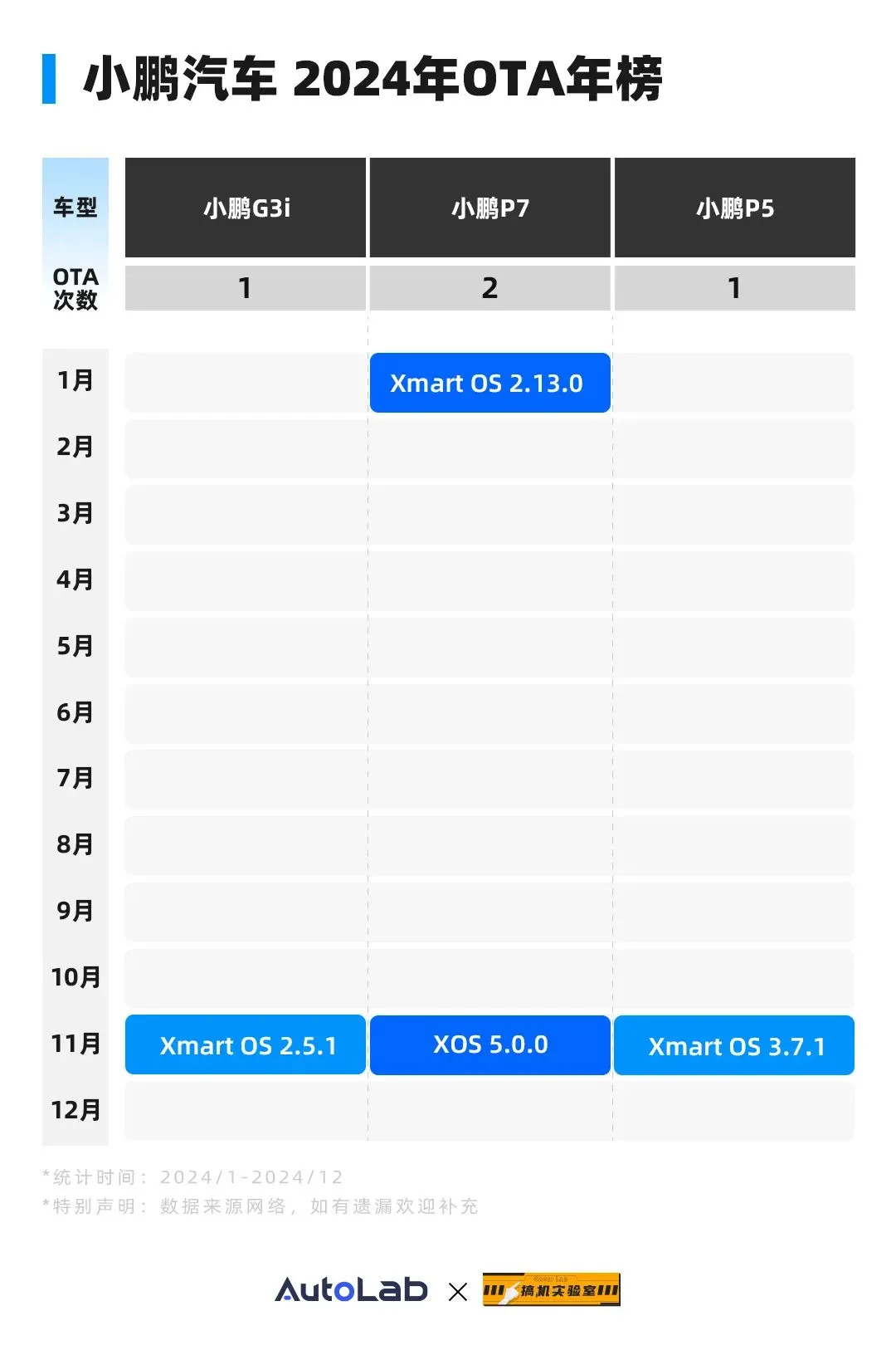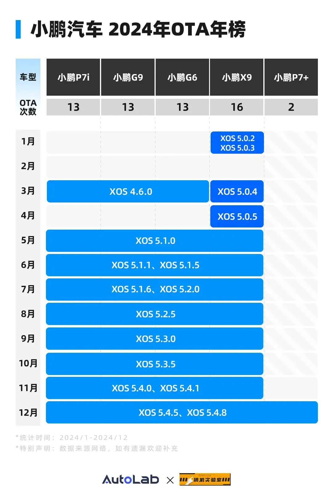 其中,大部分车型都在 2024 年完成了从 Xmart OS 到 XOS 的大版本升级。24 年初上市的小鹏 X9,更是凭借一年 16 次的 OTA 记录傲视群雄。