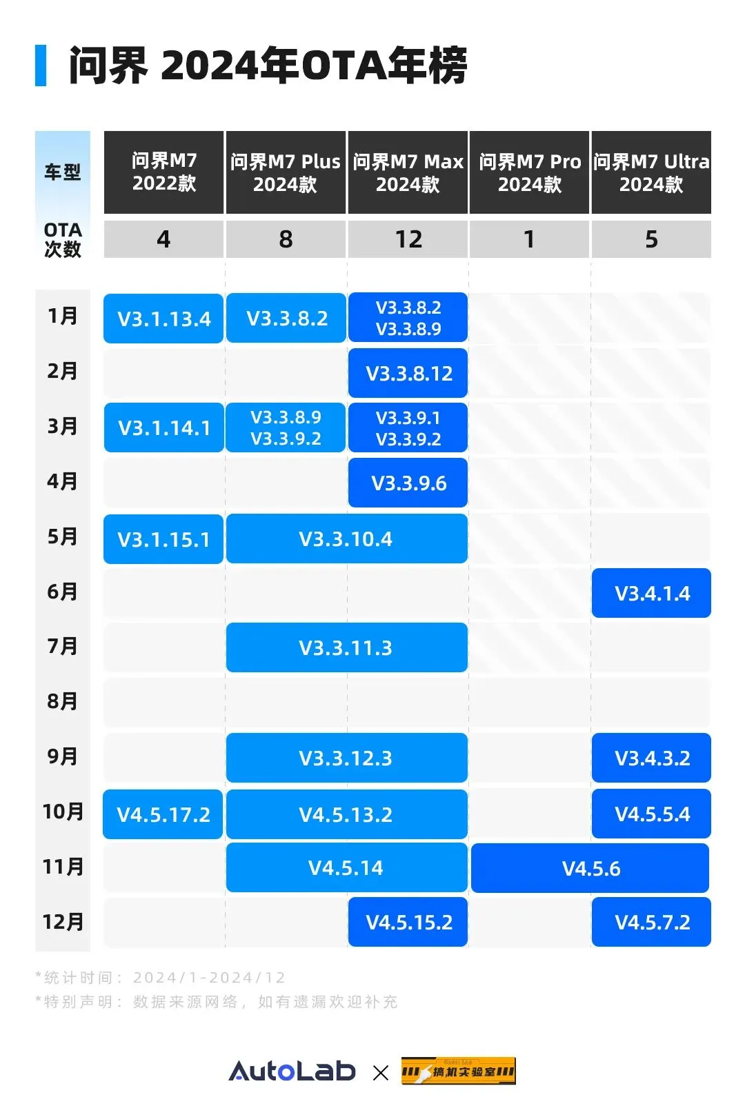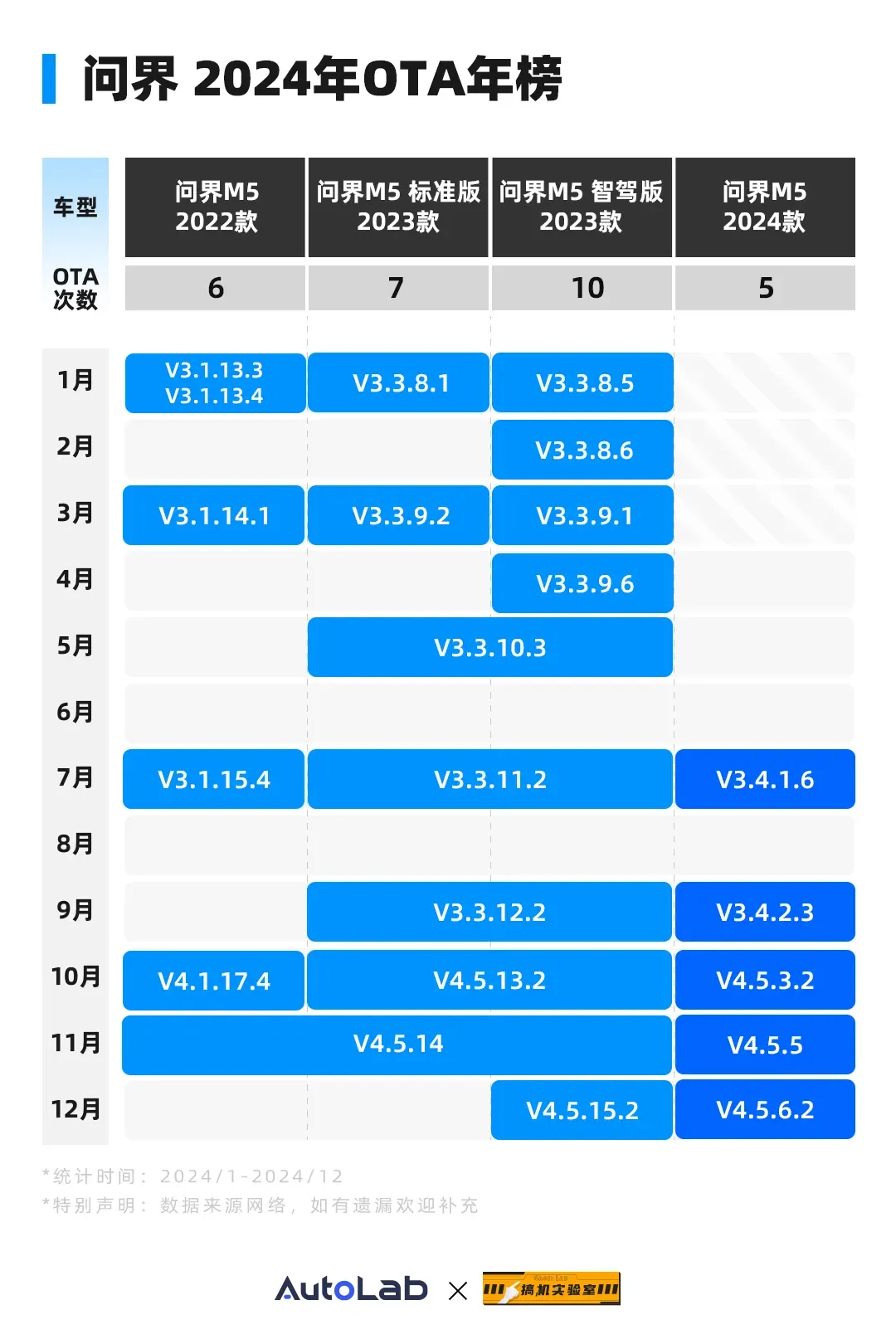 至于 24 款问界 M5,OTA 的总次数上最少的主要原因其实是上市时间最短,下半年的更新节奏还是十分在线的。