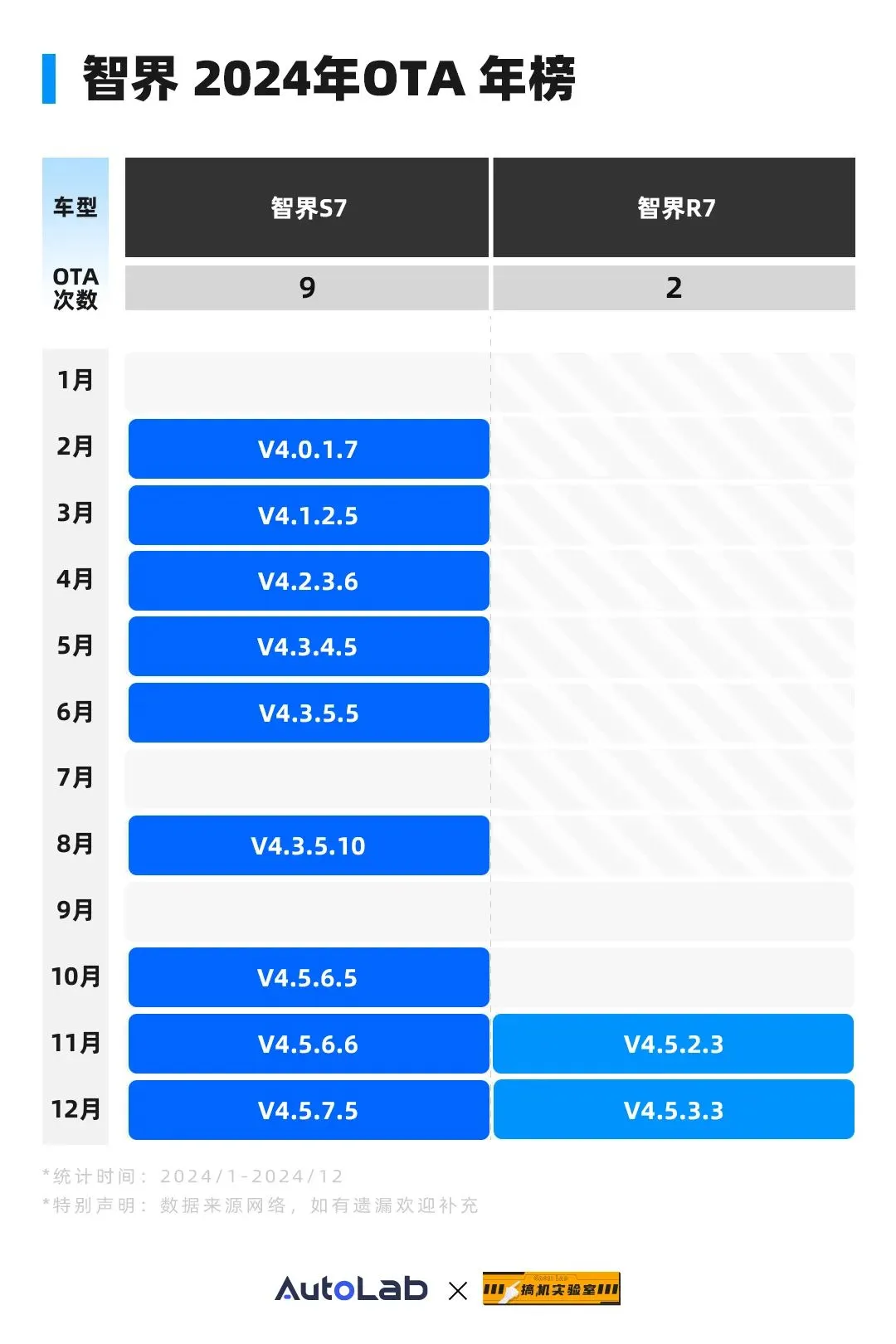 智界目前一共有两款车型,分别是智界 S7 和智界 R7。两台车的 OTA 频率都不低,9 月才上市的智界 R7 在 2024 年也进行了 2 次 OTA 更新。