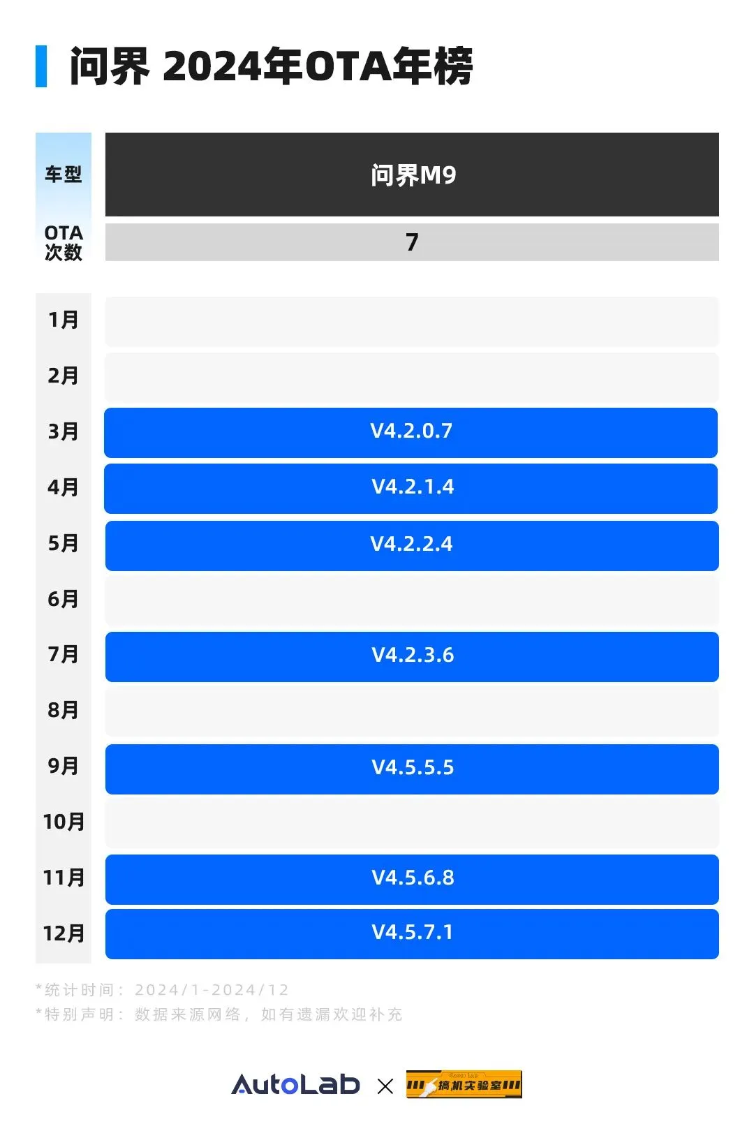 最后来看看家族旗舰问界 M9,由于上市就搭载了鸿蒙座舱 4.0,因此它在 2024 年的 OTA 总次数并不是家族里最多的。