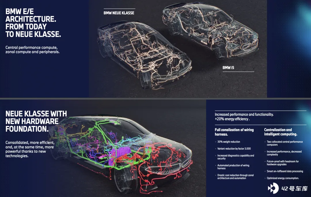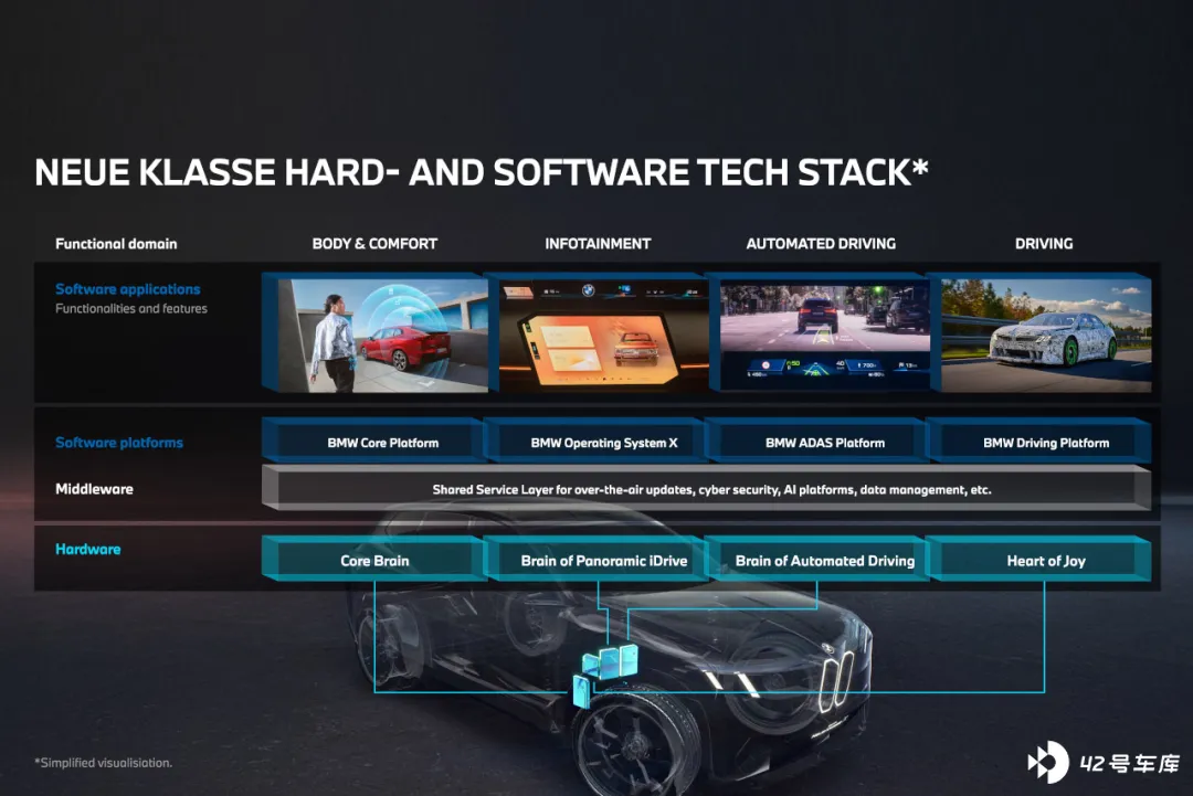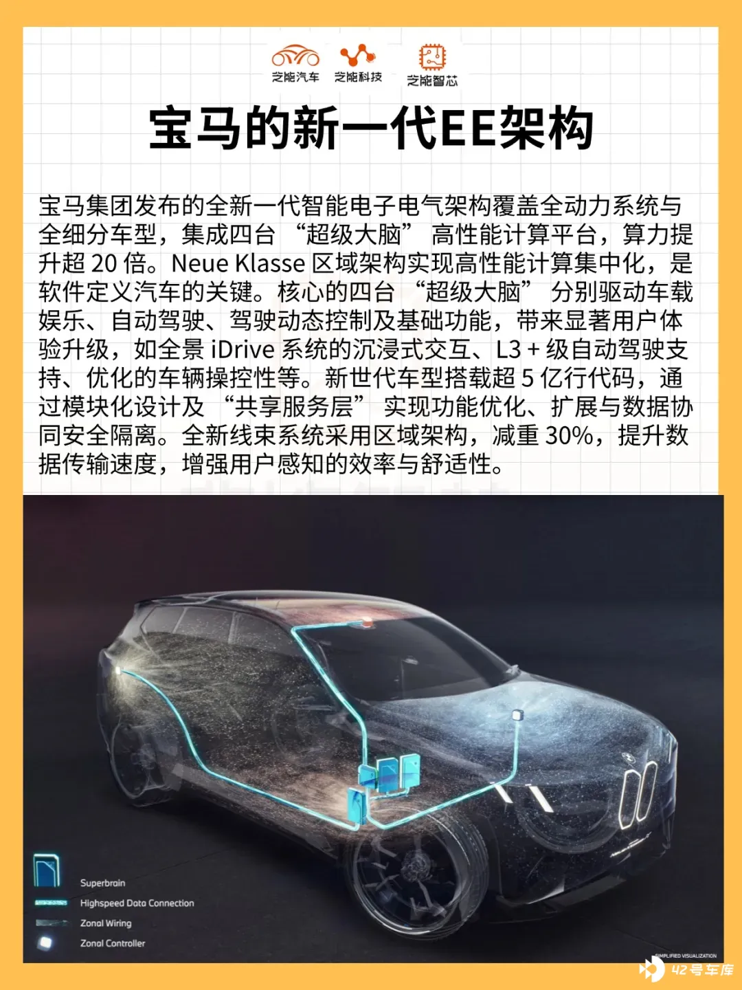 宝马集团发布了全新一代智能电子电气架构,覆盖全动力系统和全细分车型,集成四台高性能计算平台——「超级大脑」,分别驱动车载娱乐、自动驾驶、驾驶动态控制及基础功能,算力较现款车型提升 20 倍以上。