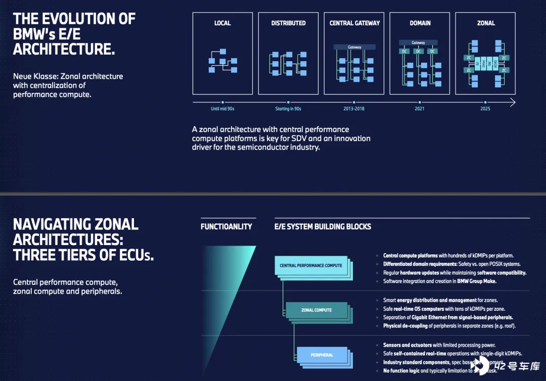 宝马的电气与电子 (E/E) 架构历经了从本地、分布式、中央网关、域到区域架构的演变。