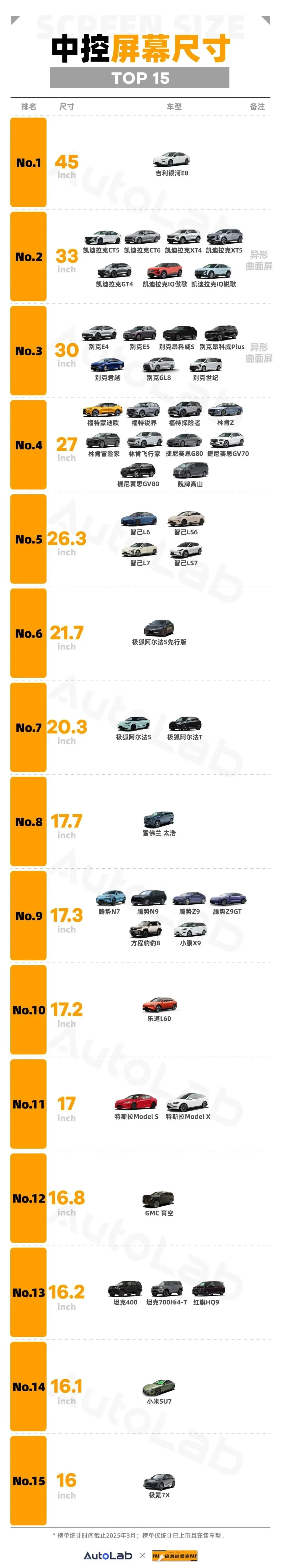 所以在中控屏幕尺寸 TOP 15 的排行榜中,理想只能遗憾「出局」了。