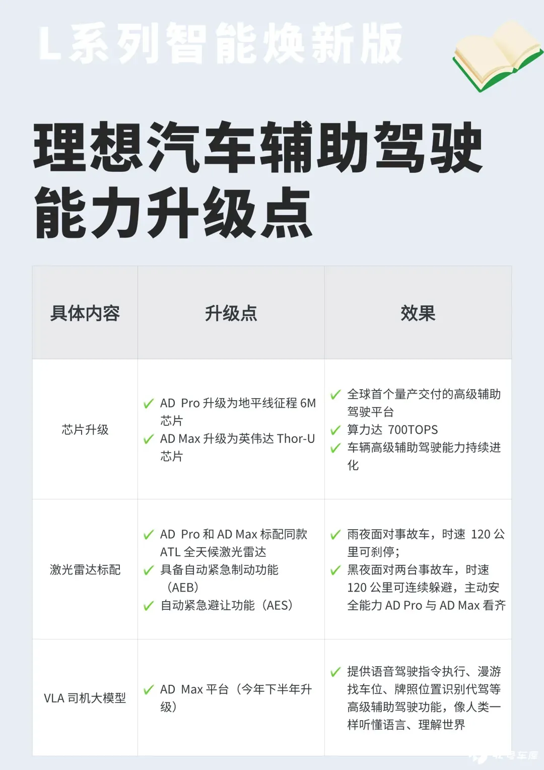 理想在 5 月 8 号发布了 L 系列的智能焕新版,升级包括理想同学更「人性」了 (外形+记忆能力+CUA 模型) ,底盘更舒适了,电池更大了 (L8/7 Max 向 Ultra 看齐) ,豪华配置更多了 (座椅按摩、家庭影院、800 万像素的流媒体内后视镜) ,当然我们最关注的还是在辅助驾驶能力上的升级。