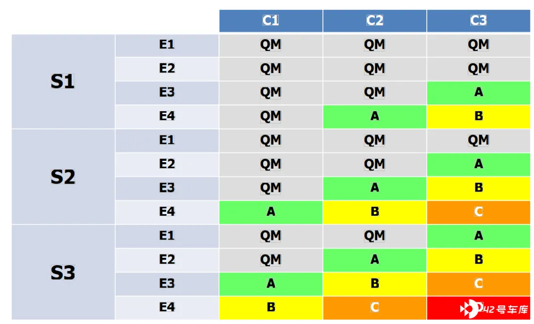 对于汽车系统中的某一个危害事件,通过评估它的严重度 S 、暴露度 E 和可控性 C 就可以通过查表确定它对应的 ASIL 等级了。其中 QM 代表没有安全风险。