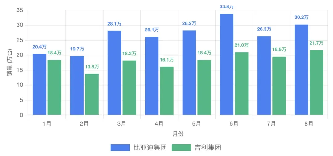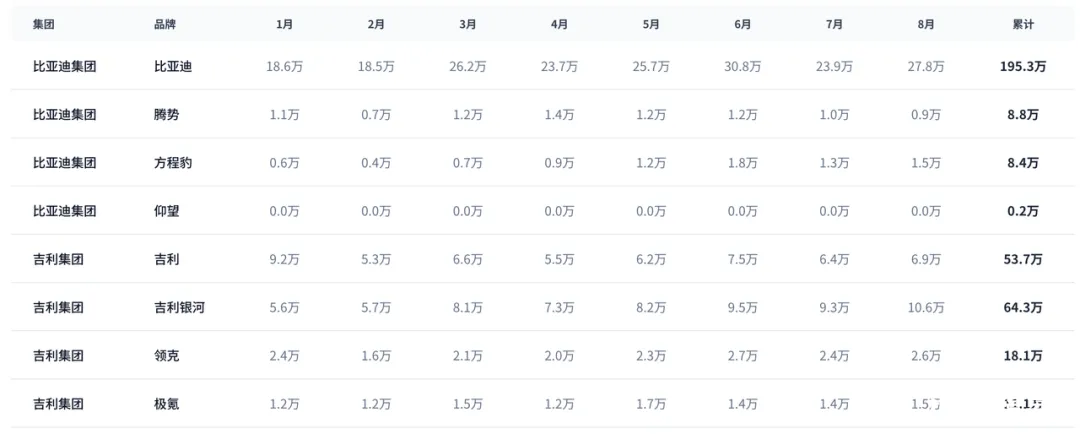 ◎ 吉利集团则在 6-8 月保持持续增长,特别是银河品牌在 8 月突破 10 万辆。
