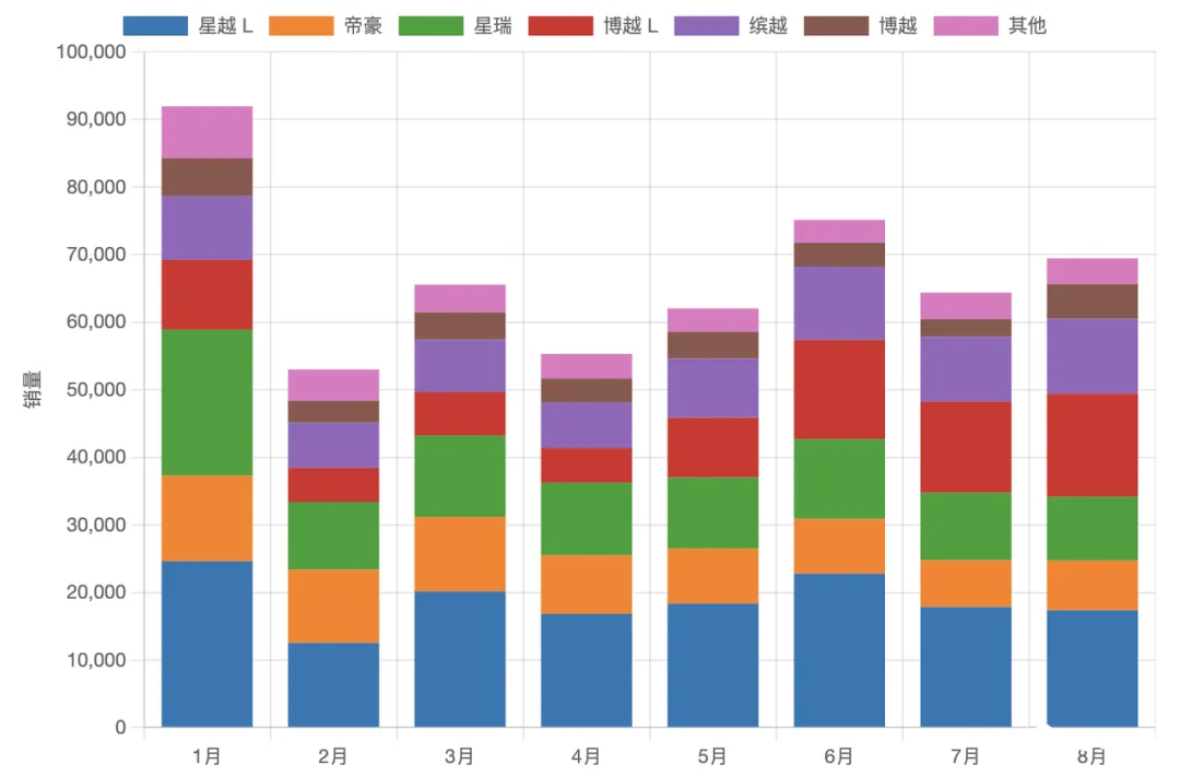 ◎ 博越 L 表现出明显的增长趋势,尤其 6 月开始放量,连续三个月稳定在 1.3-1.5 万辆区间,8 月冲到 1.52 万辆 。
