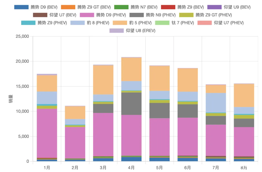 ◎ 新车型腾势 N9 从 3 月起快速放量,4 月达到 4,493 台后逐步回落至 8 月 1,700 台。
