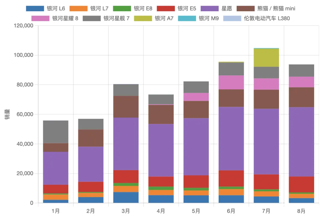 2025 年 1-8 月,吉利银河序列整体保持强劲增长,尤其是两款重点车型星愿和银河 E5 成为销量主力:
