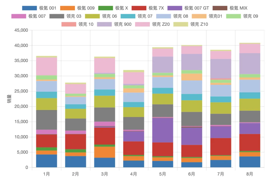 ◎ 领克 08 在 6 月刷新 4,434 台新高,7、8 月仍保持 4,000 台以上