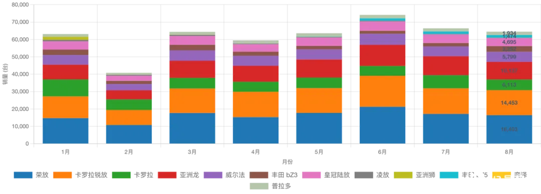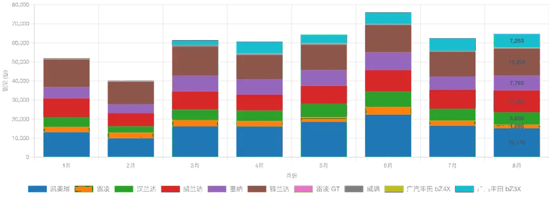 广汽丰田在 8 月共售出 6.47 万辆,从产品来看主要依靠几款车型车型。