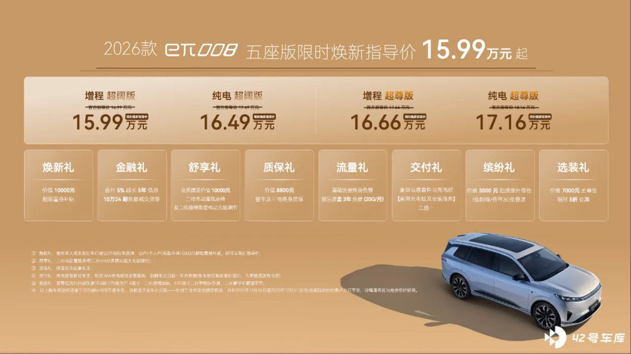 2025 年 10 月 16 日,东风奕派推出 2026 款 eπ008 五座版,售价 15.99 万元起。该车型专为城市家庭和中产阶级设计,提供多重购车权益,包括 10000 元的置换补贴和整车及三电终身质保。