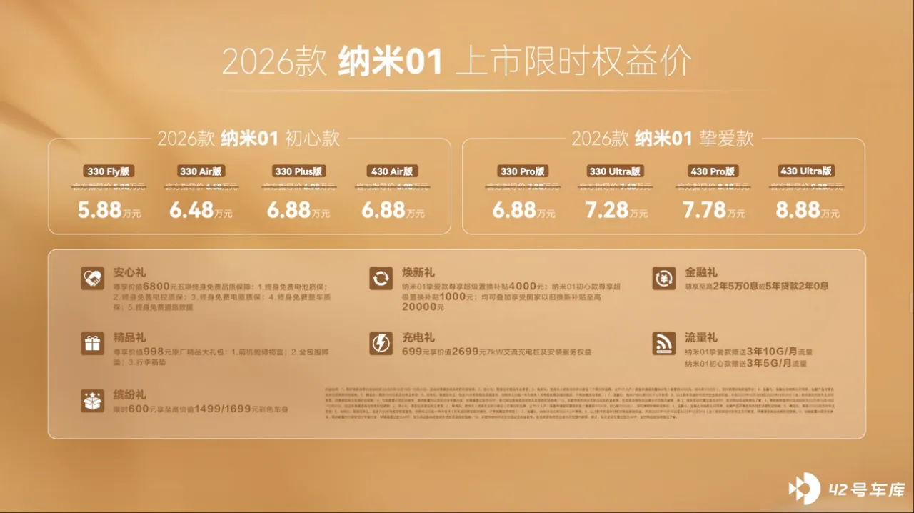 2026 款纳米 01 提供丰富的购车权益,限时焕新价 5.88 万元起,并提供七重购车好礼,包括安心礼、焕新礼、金融礼、精品礼、充电礼、流量礼与缤纷礼。用户还可享受超级置换补贴。