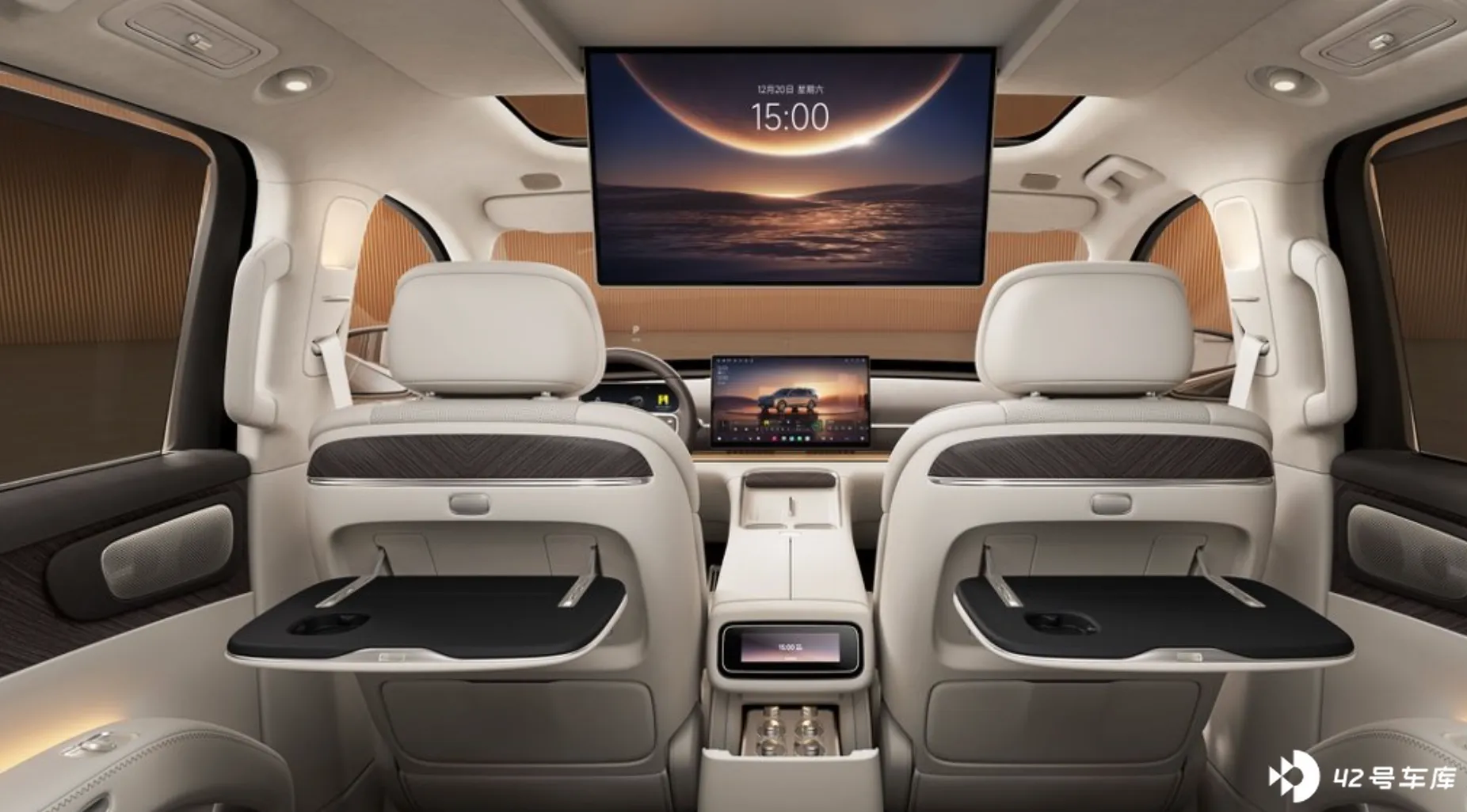 二排是作为整车舒适体验的核心区域来设计的,支持 120° 的零重力躺姿、四向电动腿托以及 ABTS 一体式安全带,给二排乘客带来比较悬浮的体验。