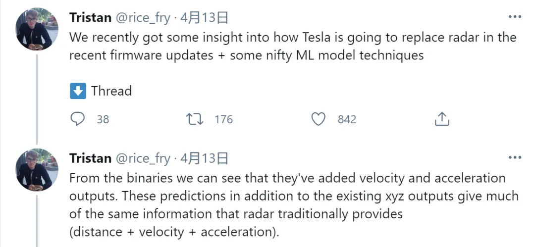 根据 Tristan 的说法,从新固件的二进制文件中可以看出,Autopilot 的深度神经网络增加了许多新的输出,除了现有的 xyz 输出外,还包括许多传统雷达输出的数据,例如距离、速度和加速度等等。