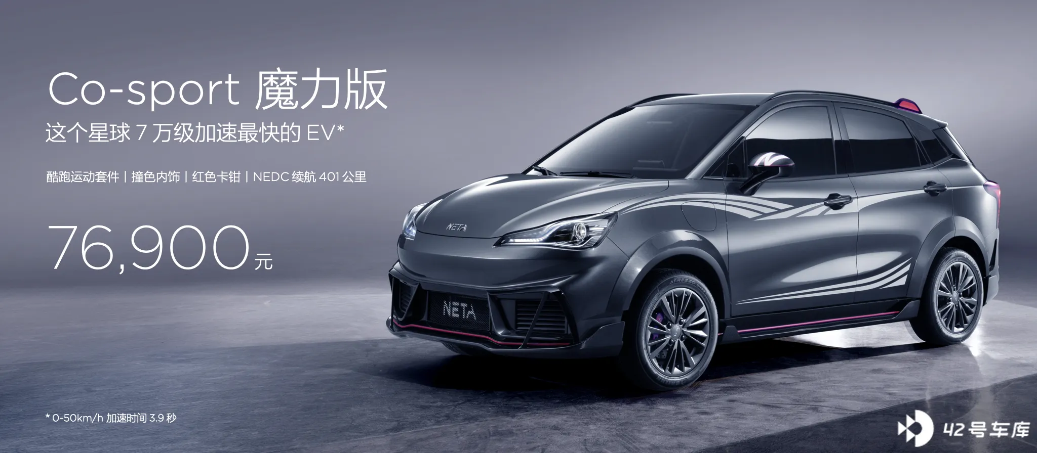 - 哪吒 V Co-sport 魔力版,拥有更为运动的黑红配色以及红色刹车卡钳,0-50 km/h 3.9 秒。售价 76,900 元,续航 400 公里,预计 8 月份交付。