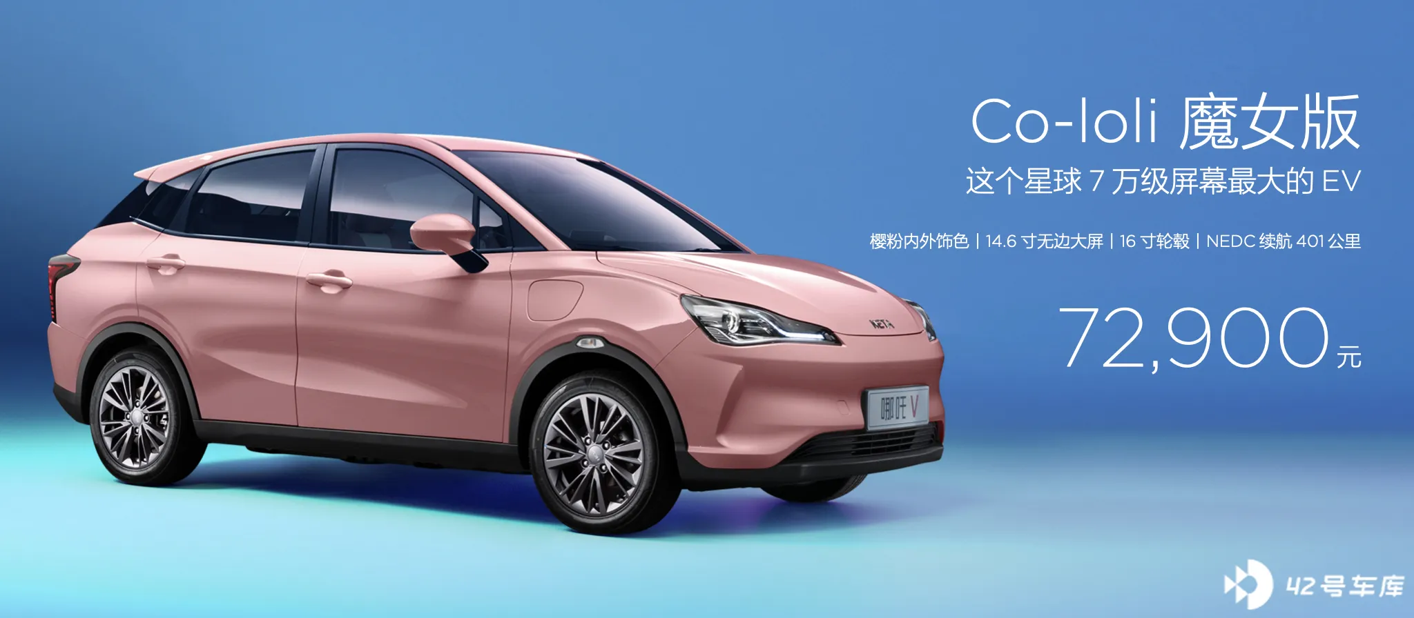 - 哪吒 V Co-loli 魔女版,采用樱花粉配色以及 号称这个星球 7 万级 EV 最大屏幕 14.6 英寸的中控大屏,售价 72,900 元,续航同样是 400 公里。