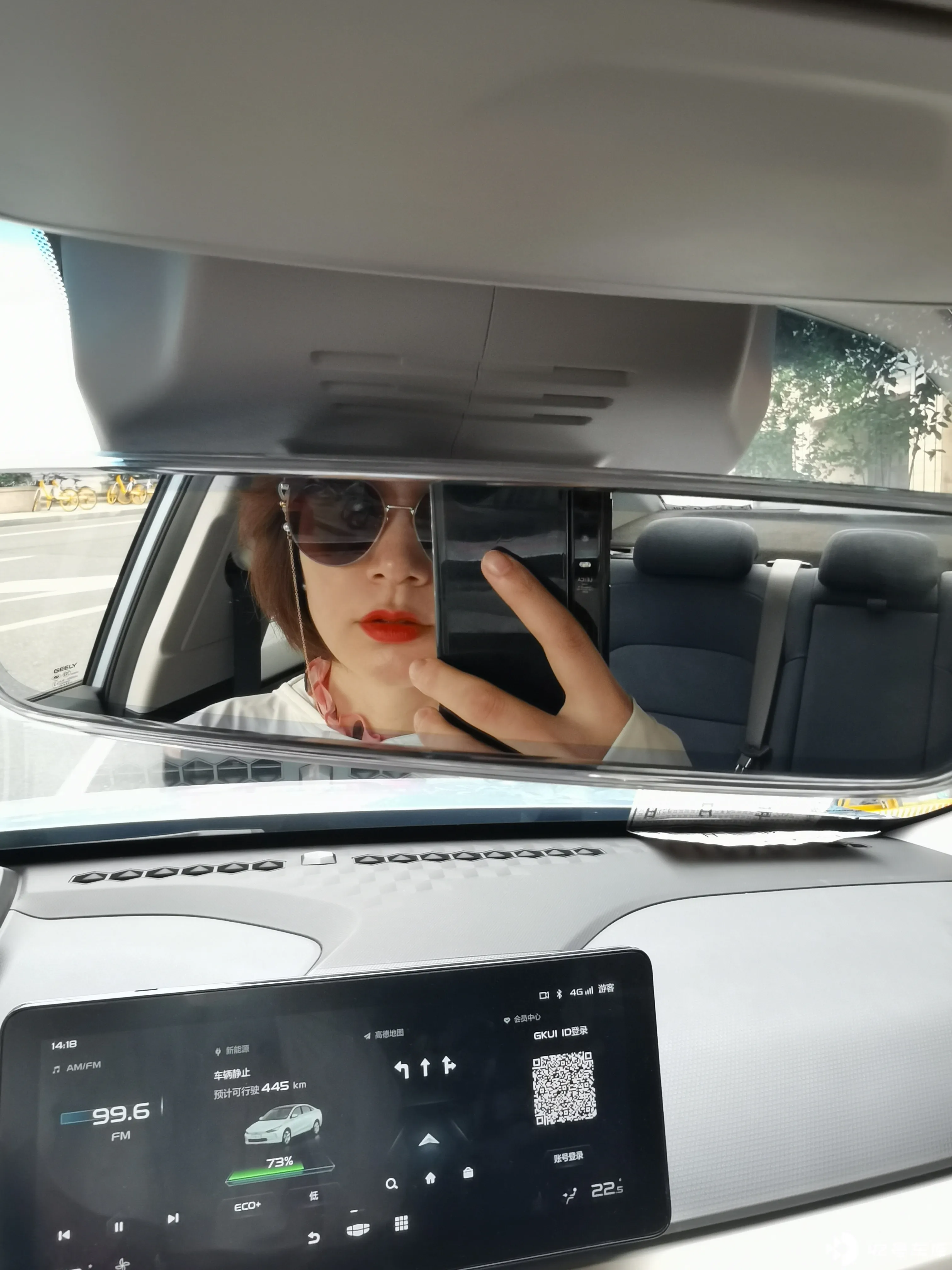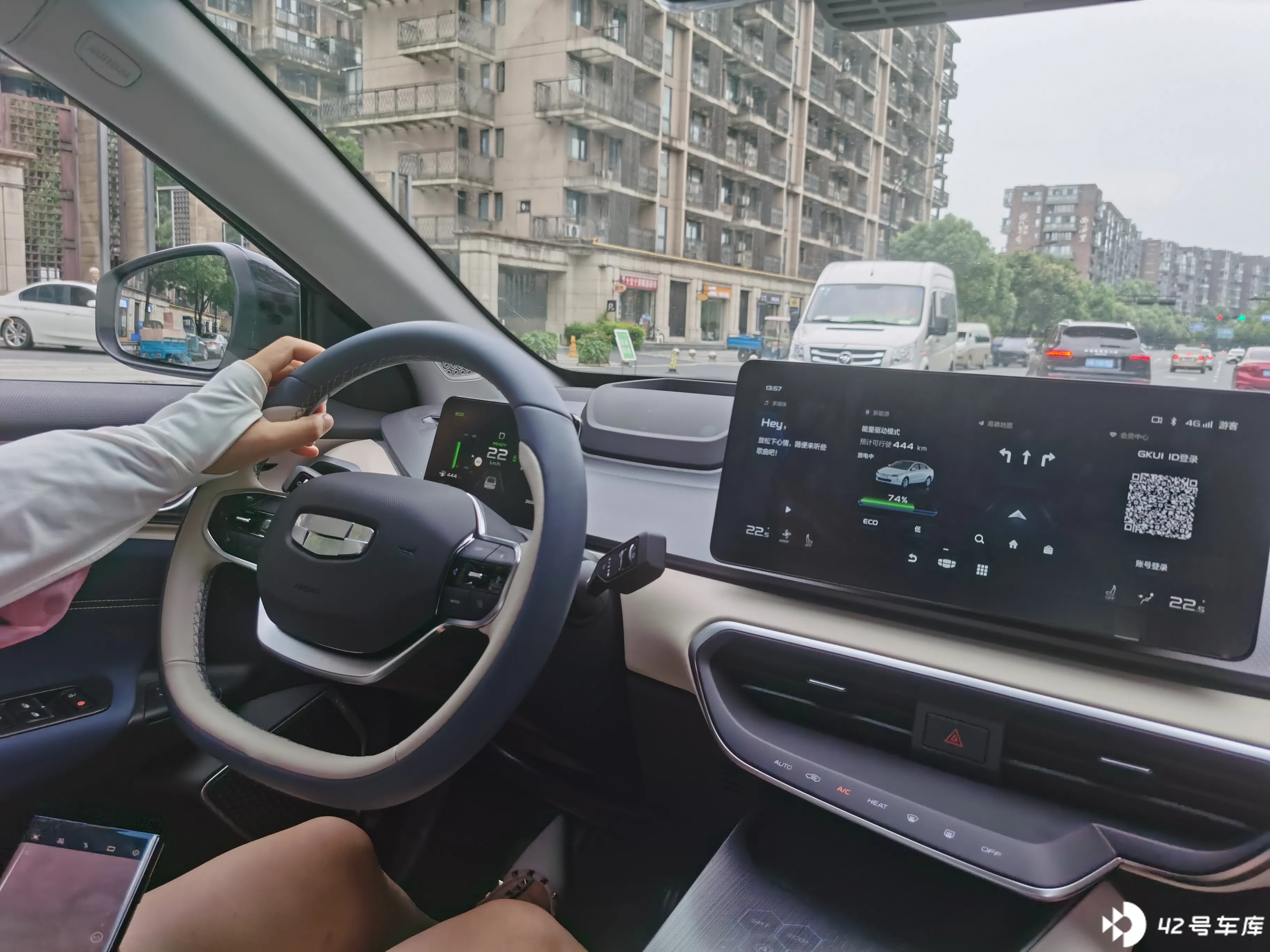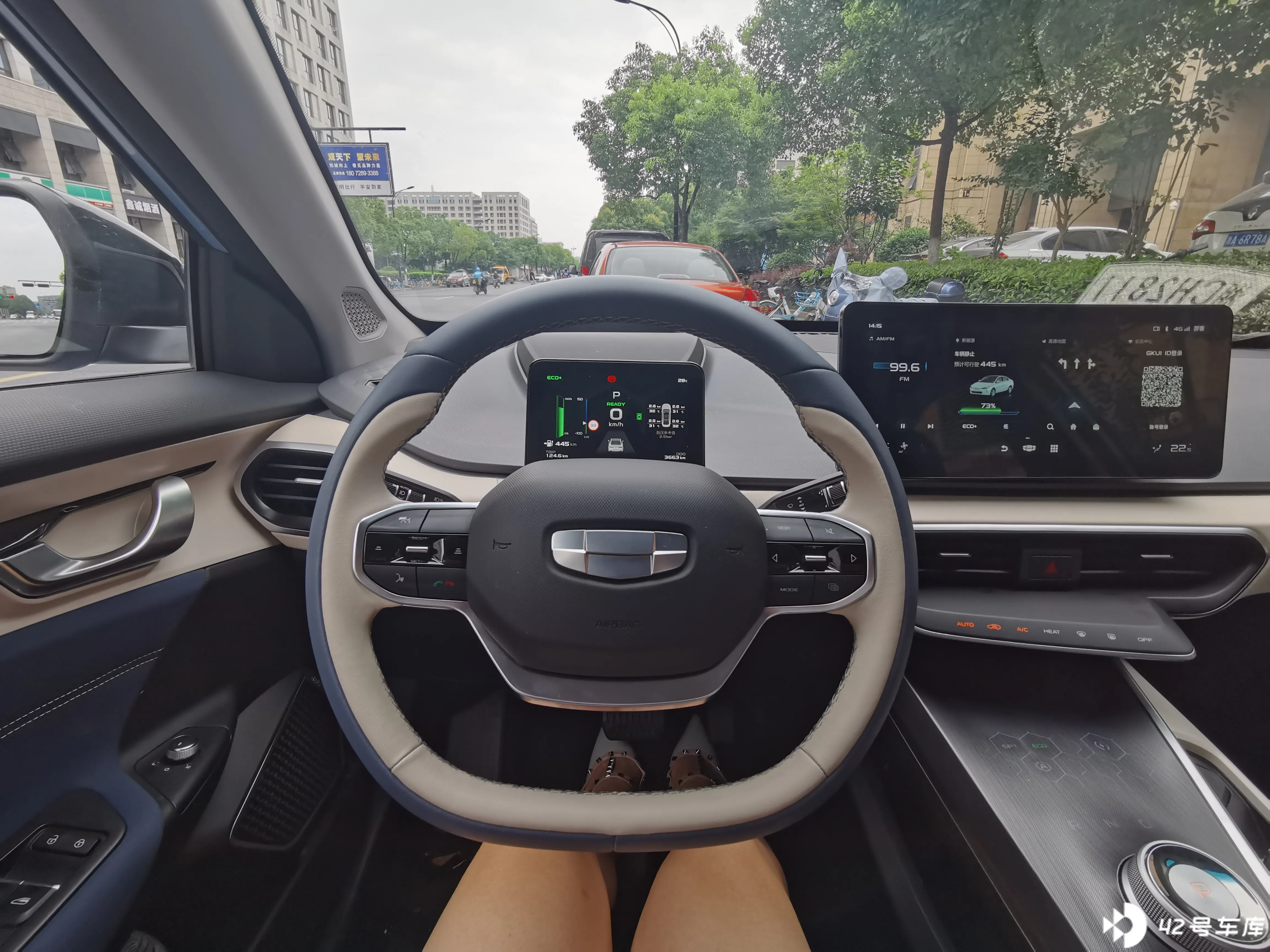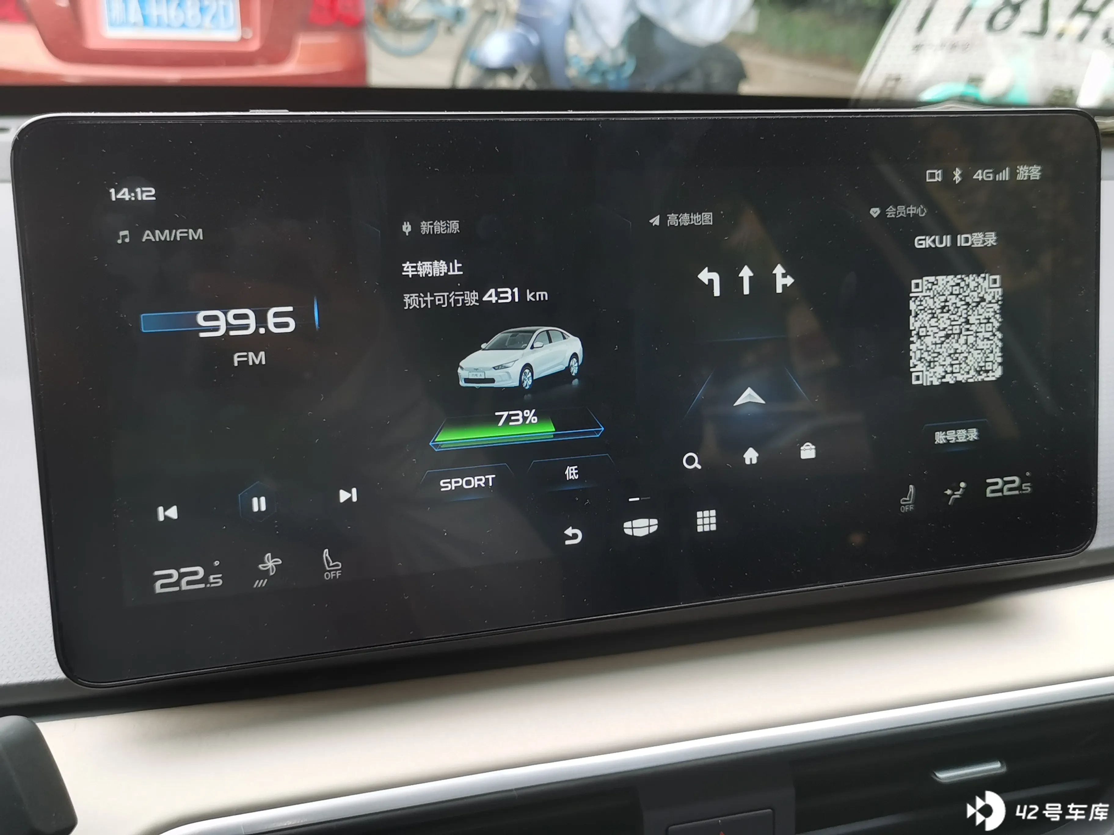 中控屏是一块长屏,显示 FM / 音乐、车辆状态、地图、会员中心(因为试驾车不能给开通 GKUI ID,所以看不到会员中心详情,也没法体验车控功能)等信息。